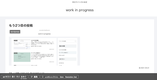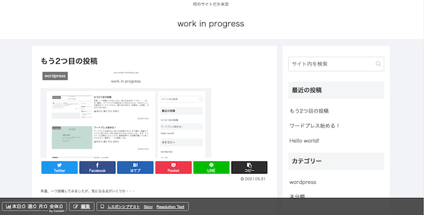 まぁ、こんな見た目ですよね、Cocoon。何も設定しなくてもそこそこシンプルで、たぶん設定をすると派手にも地味にも出来るような気がします。いくつか無料有料ワードプレス・テーマを使ってみて、一番いいと思ってるのがCocoonなので、今回、これを更にシンプルにしていくテストをします。