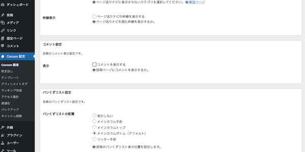 ついでに最下部の「コメント」も消します。これはCocoon設定の「コメント」のところじゃなくて「投稿」のところで